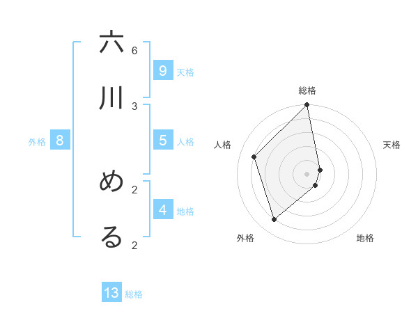 六川 めるさんの総格は13画の5点!