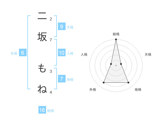 二坂 もねさんの総格は16画の5点!