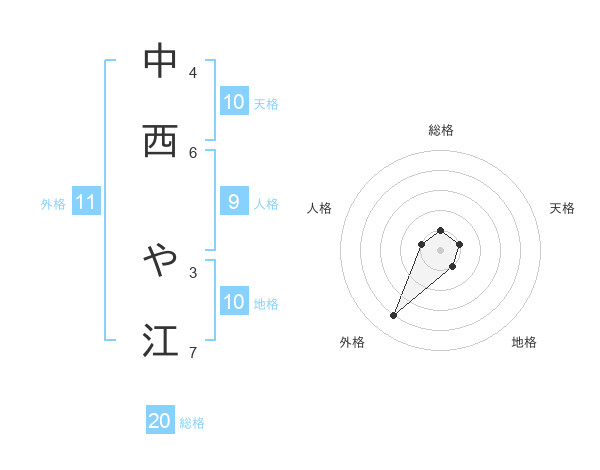 中西 や江さんの総格は20画の1点!