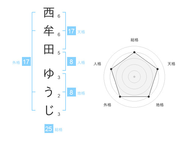 西牟田 ゆうじさんの天格は17画の4点!