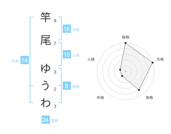 竿尾 ゆうわさんの天格は16画の5点!