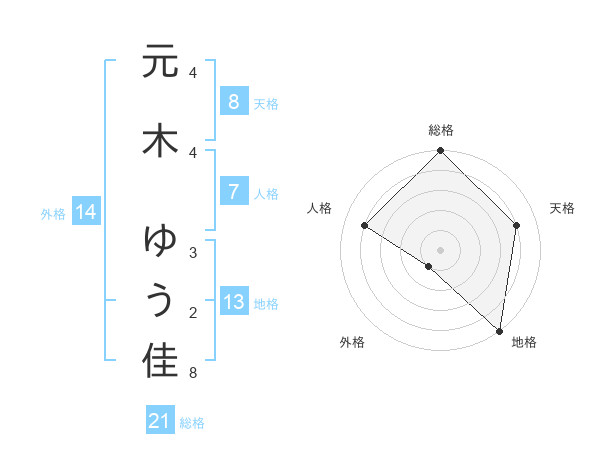 元木 ゆう佳さんの天格は8画の4点!