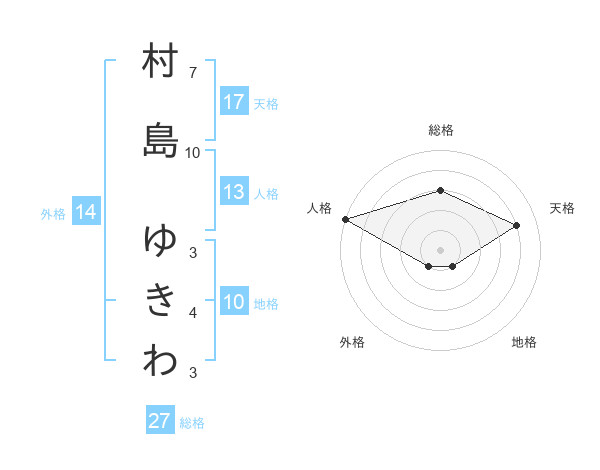 村島 ゆきわさんを姓名の画数から五運を鑑定