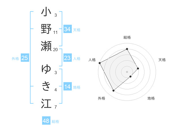 小野瀬 ゆき江さんを姓名の画数から五運を鑑定
