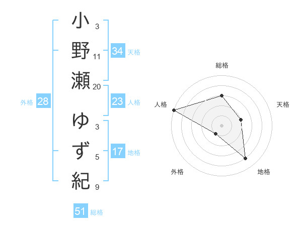 小野瀬 ゆず紀さんの総格は51画の3点!