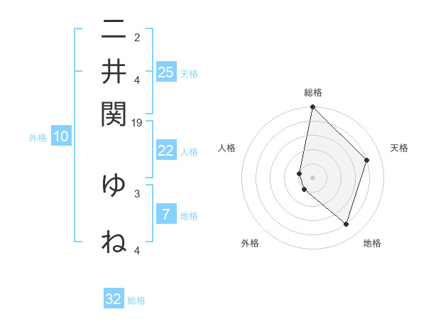 二井関 ゆねさんの総格は32画の5点!