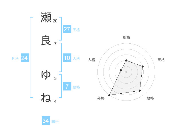 瀬良 ゆねさんの総格は34画の2点!
