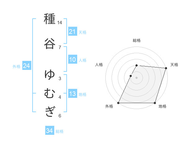 種谷 ゆむぎさんの天格は21画の5点!