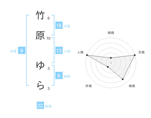 竹原 ゆらさんの総格は22画の1点!