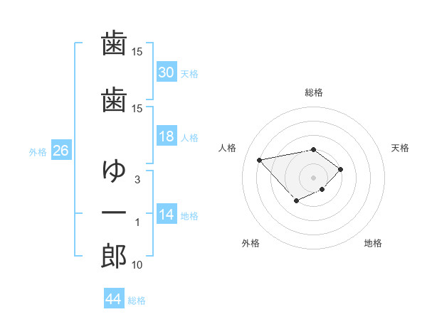 歯歯 ゆ一郎さんの天格は30画の2点!