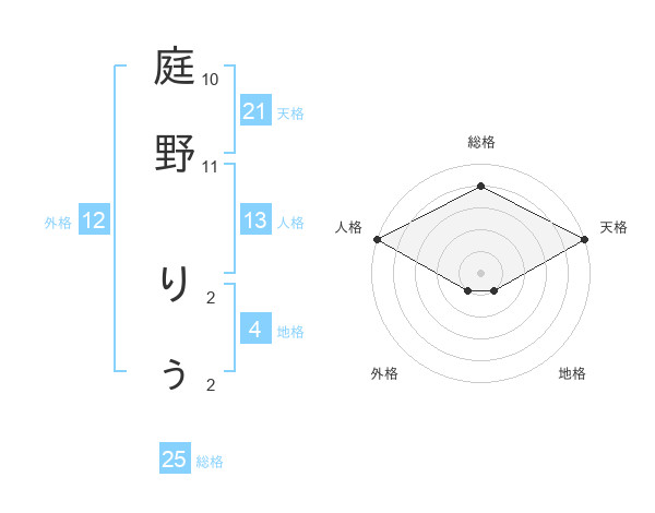 庭野 りぅさんを姓名の画数から五運を鑑定