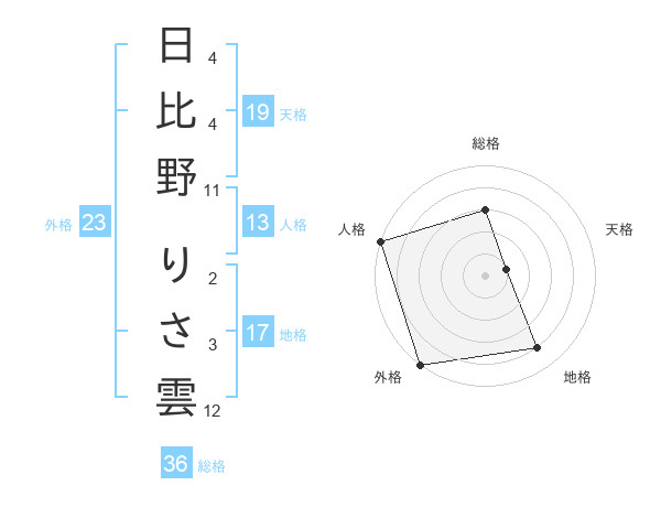 日比野 りさ雲さんの外格は23画の5点!