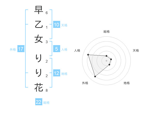 早乙女 りり花さんの総格は22画の1点!