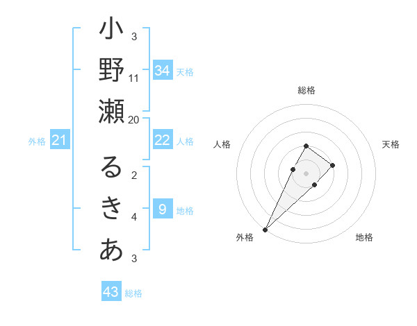 小野瀬 るきあさんの外格は21画の5点!