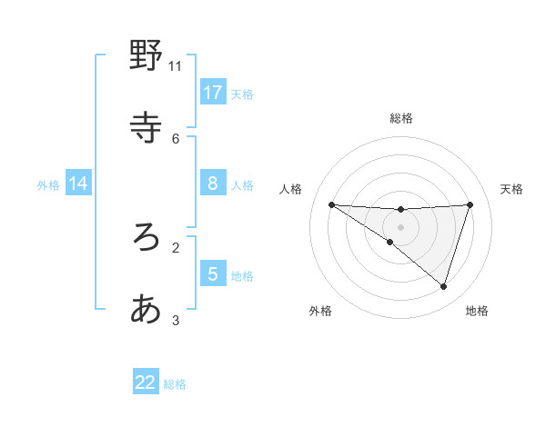 野寺 ろあさんの総格は22画の1点!