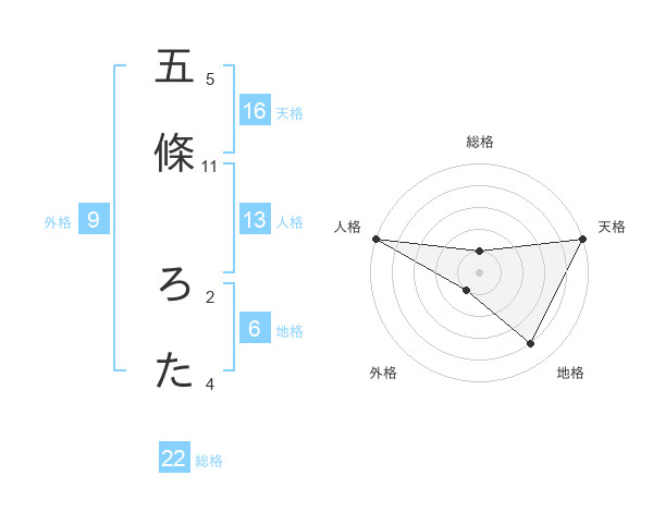 五條 ろたさんの総格は22画の1点!