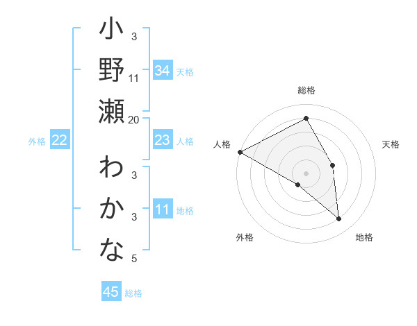 小野瀬 わかなさんを姓名の画数から五運を鑑定