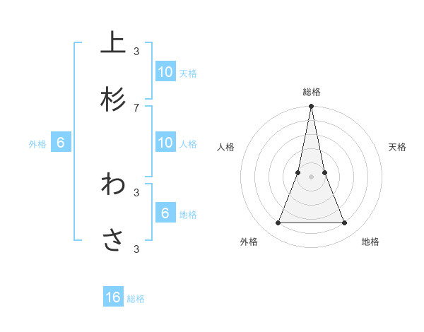 上杉 わささんの総格は16画の5点!