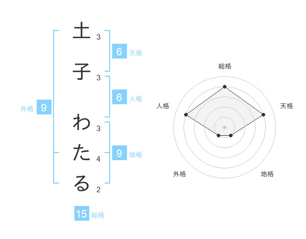 土子 わたるさんの総格は15画の4点!