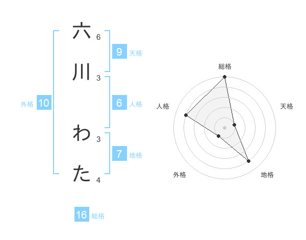 六川 わたさんの総格は16画の5点!