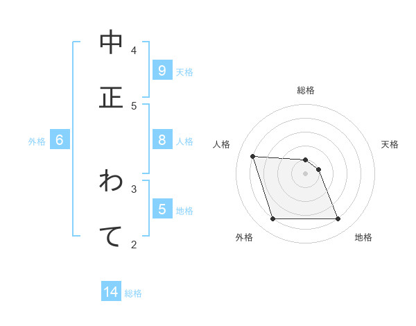 中正 わてさんの総格は14画の1点!