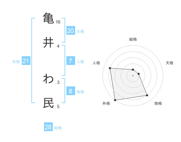 亀井 わ民さんの総格は28画の1点!