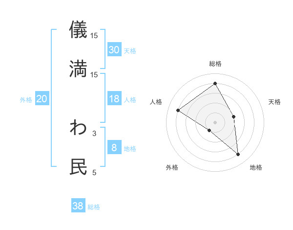 儀満 わ民さんの総格は38画の4点!