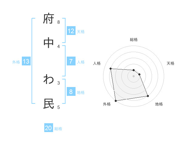 府中 わ民さんの総格は20画の1点!