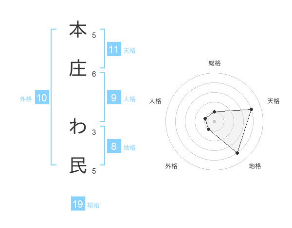 本庄 わ民さんの総格は19画の1点!