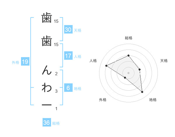 歯歯 んわーさんの天格は30画の2点!