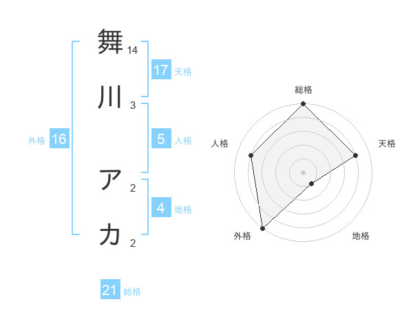 舞川 アカさんの総格は21画の5点!