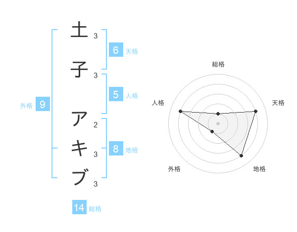 土子 アキブさんの総格は14画の1点!