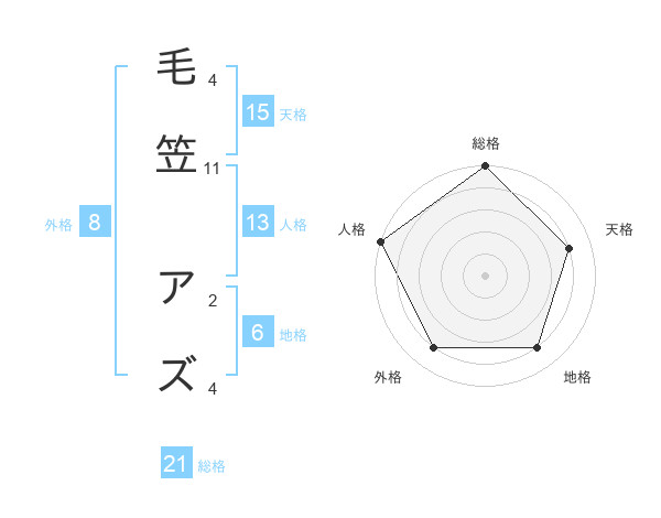 毛笠 アズさんの総格は21画の5点!
