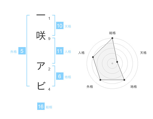 一咲 アビさんの総格は16画の5点!