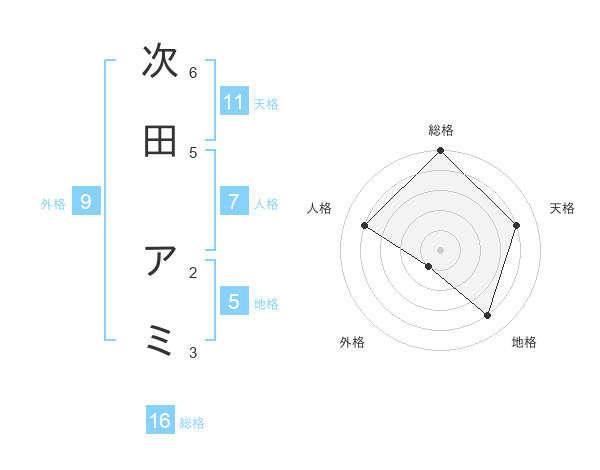 次田 アミさんの総格は16画の5点!