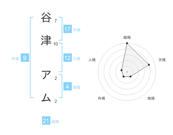 谷津 アムさんの総格は21画の5点!