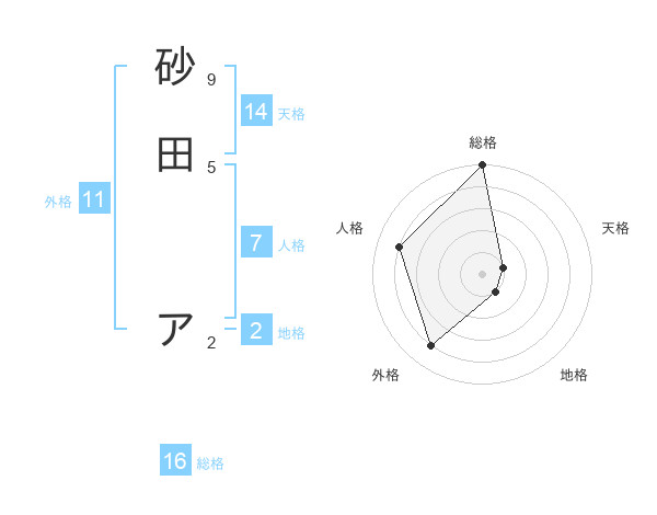 砂田 アさんの総格は16画の5点!
