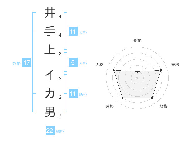 井手上 イカ男さんを姓名の画数から五運を鑑定