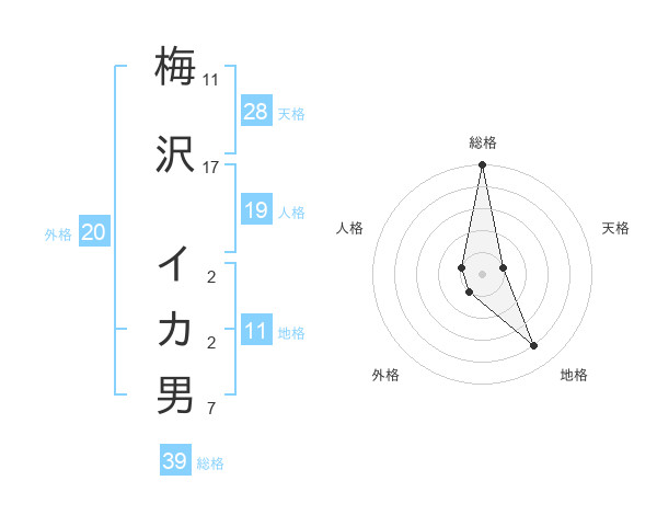 梅沢 イカ男さんを姓名の画数から五運を鑑定