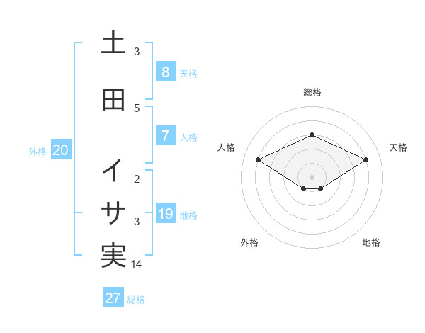 土田 イサ実さんを姓名の画数から五運を鑑定