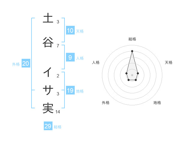 土谷 イサ実さんの総格は29画の4点!