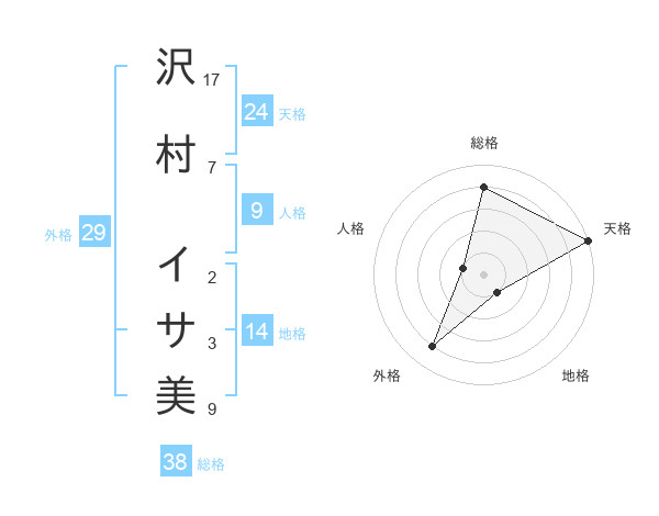沢村 イサ美さんの総格は38画の4点!