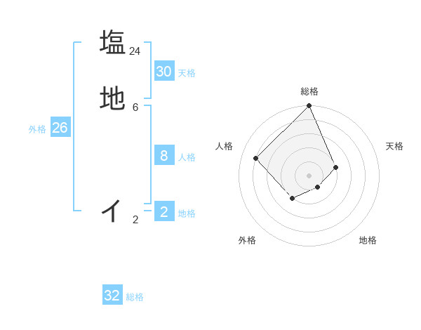 塩地 イさんの総格は32画の5点!
