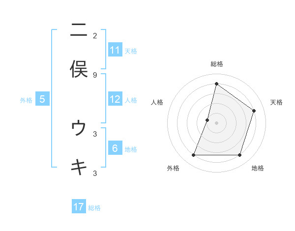二俣 ウキさんの総格は17画の4点!