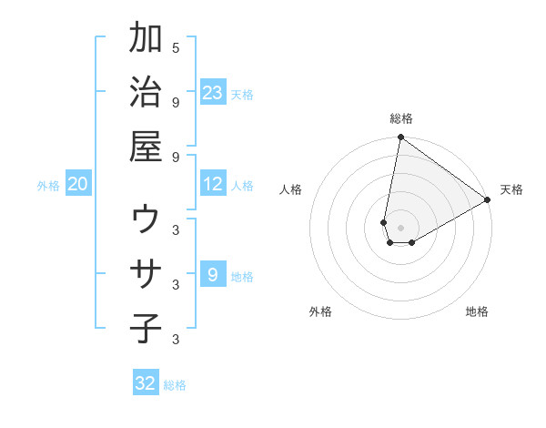 加治屋 ウサ子さんの天格は23画の5点!