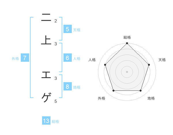 二上 エゲさんの総格は13画の5点!