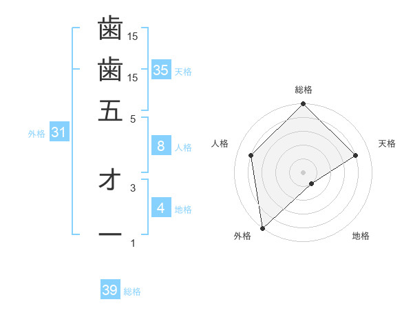 歯歯五 オーさんの総格は39画の5点!