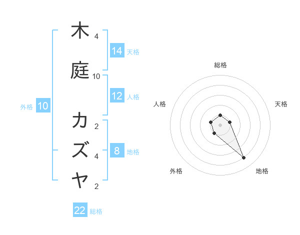 木庭 カズヤさんの総格は22画の1点!