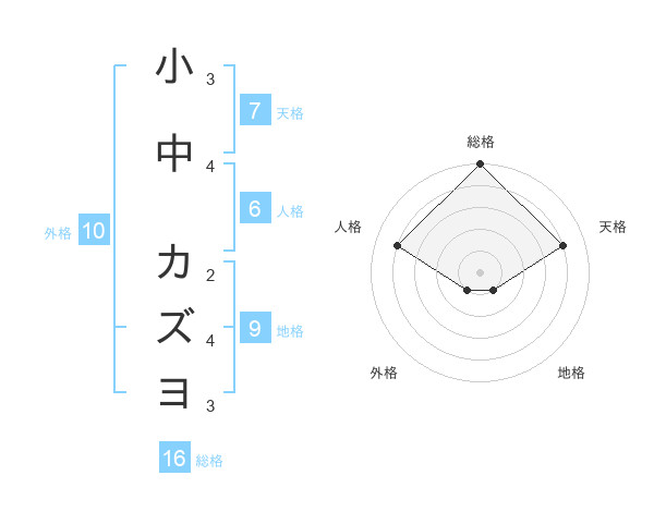 小中 カズヨさんの総格は16画の5点!