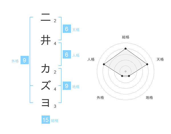 二井 カズヨさんの総格は15画の4点!